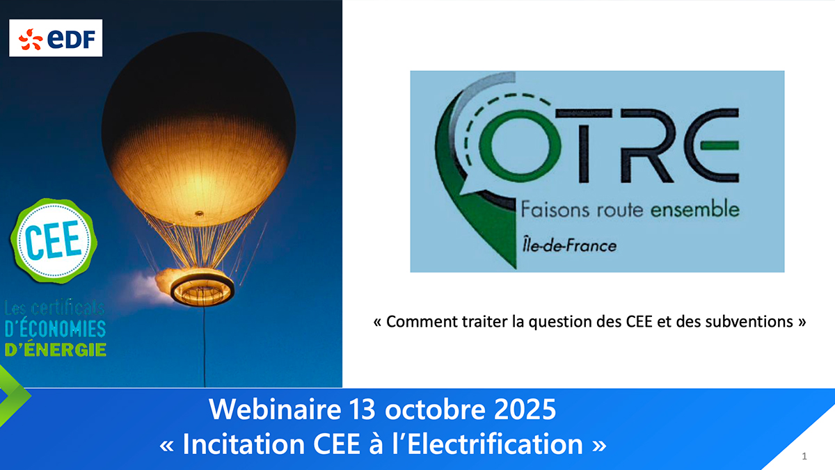 Le webinaire du 13 octobre 2025 organisé par EDF en partenariat avec OTRE Île-de-France porte sur l’incitation CEE à l’électrification des flottes et la gestion des subventions